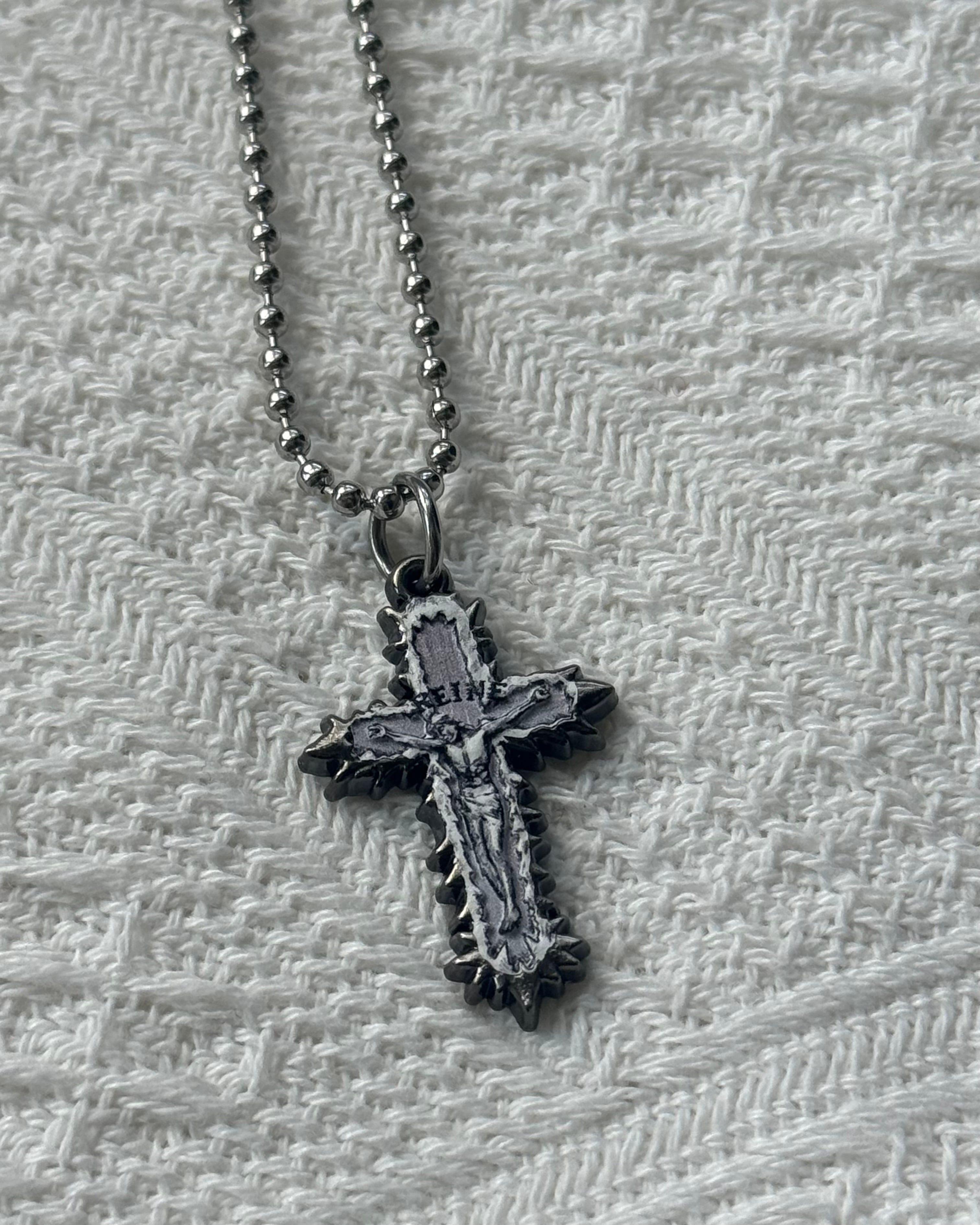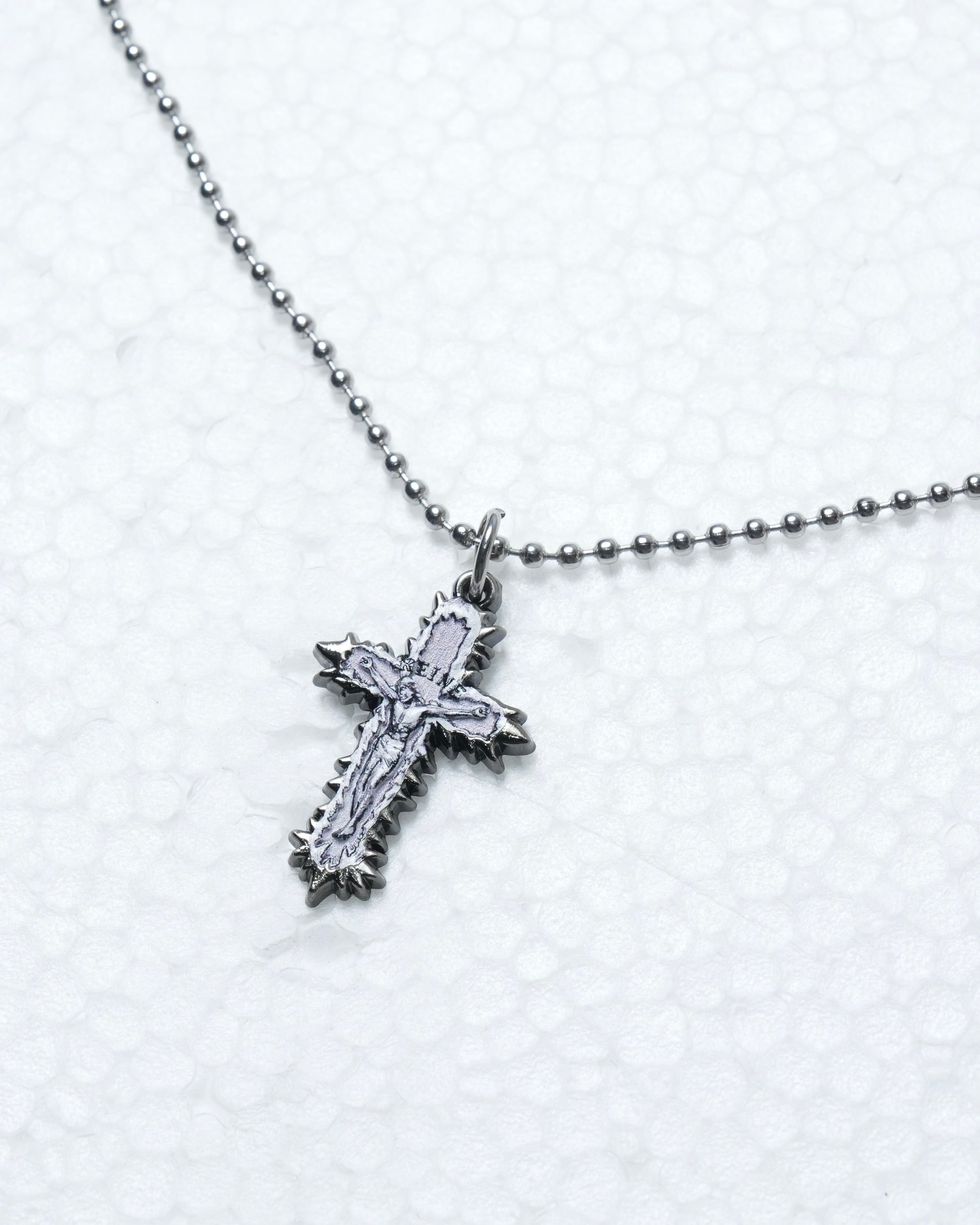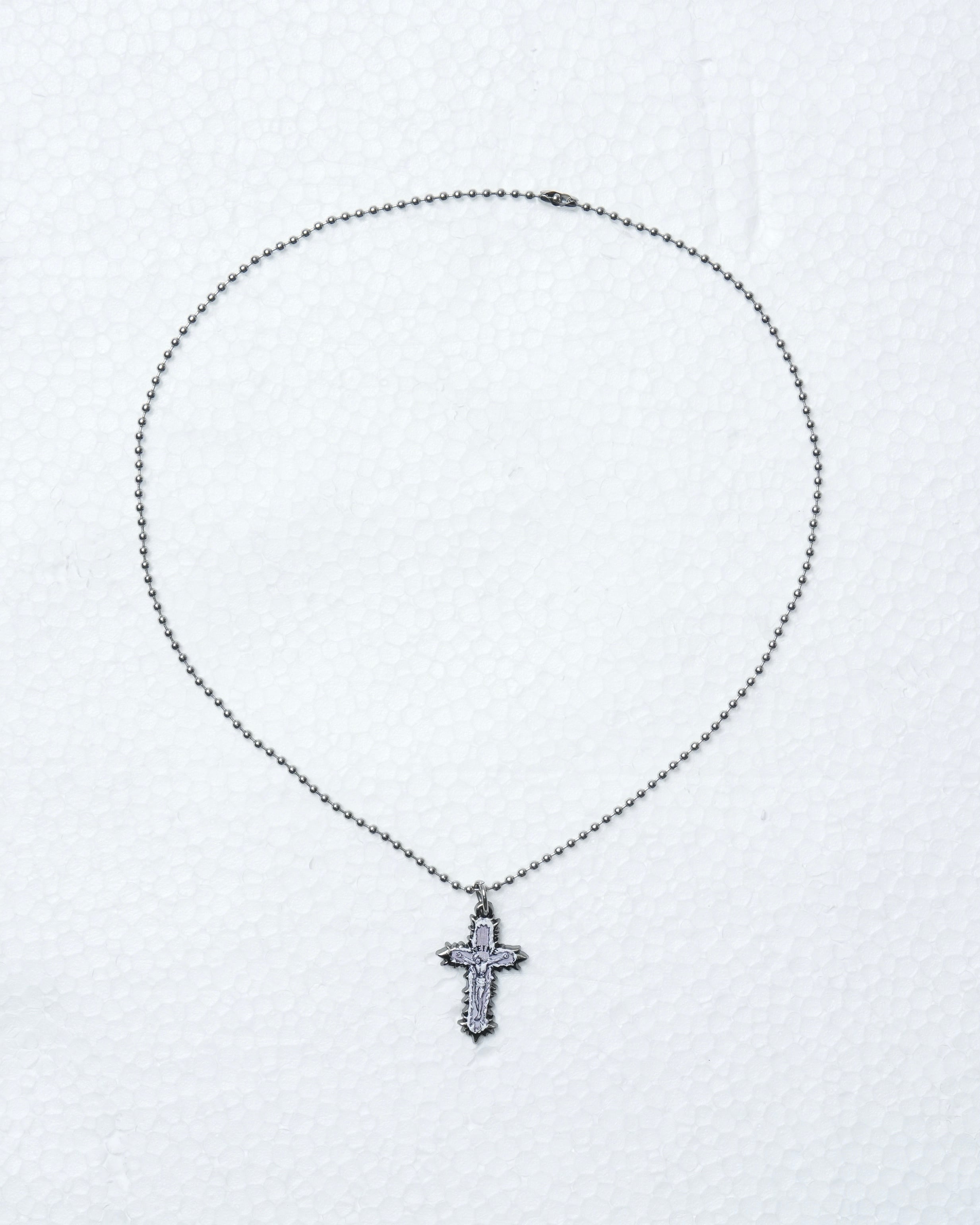 存在感のあるクロスデザインネックレス。 細部まで彫り込まれたイエス・キリストのモチーフが印象的で、エッジの効いたフォルムがコーディネートのアクセントに。 無骨さを引き立てるボールチェーン仕様で、シンプルなTシャツからジャケットスタイルまで幅広く合わせやすいアイテムです。 ユニセックスで着用可能。普段使いはもちろん、ロックやストリートテイストのスタイリングにもおすすめ。